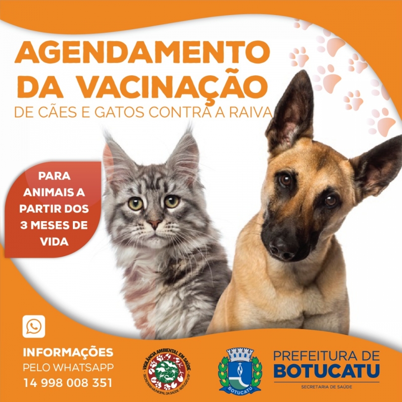 A Vigilância Ambiental em Saúde (VAS) disponibiliza a população um sistema de agendamento online para vacinação antirrábica de cães e gatos. Através do link calendly.com/vigilanciaambientalbotucatu/agendavacinaantirrabica , os tutores poderão escolher a data e horário para imunizar seus animais.