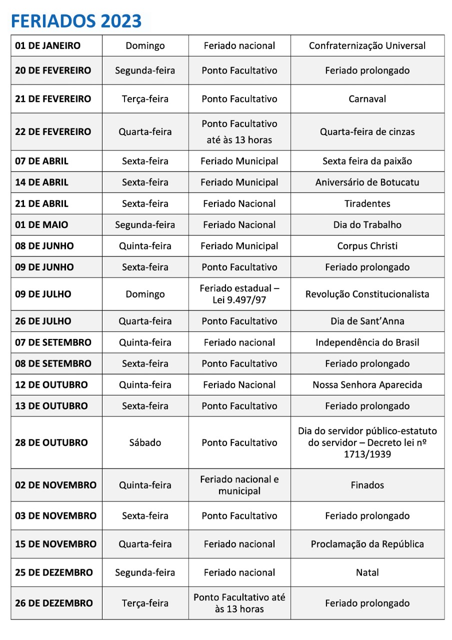 Prefeitura de Botucatu publica Decreto dos Pontos Facultativos e Feriados de 2023