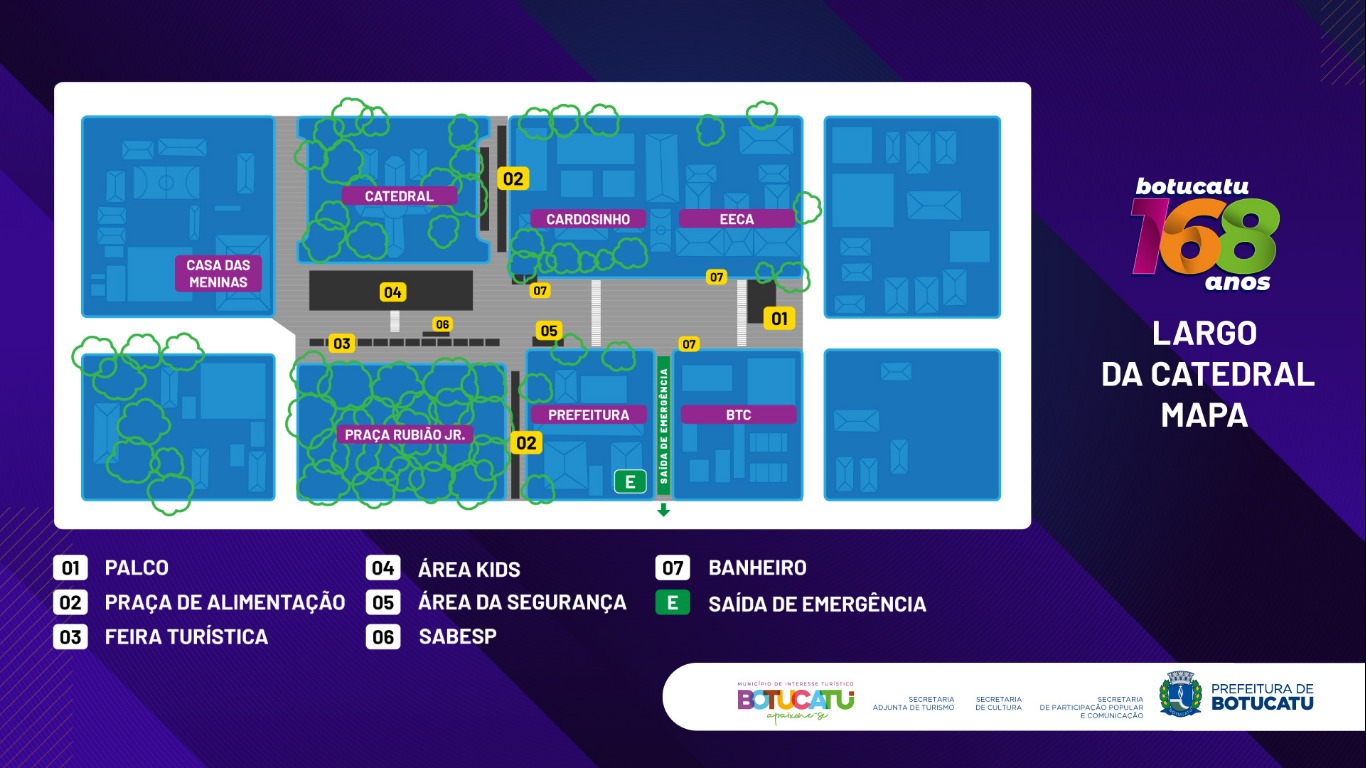 Verifique o mapa da festa dos 168 anos de Botucatu (anexo).